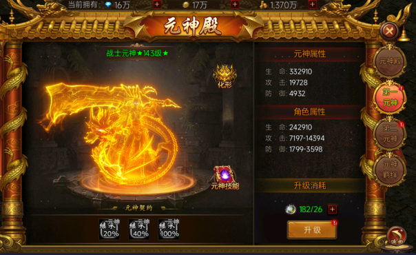 1. 提升元神殿等级可以增加召唤元神的数量,不同元神的属性和等级相互独立,升级后均可带来大量基础属性。