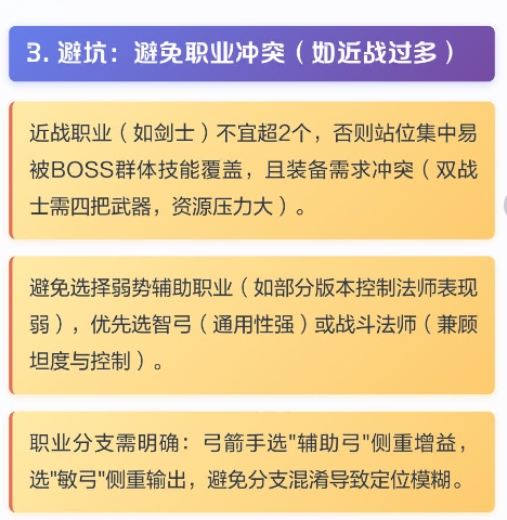 有些搭配要注意避开。近战职业别超两个,不然容易被BOSS技能全打到,而且装备需求冲突,养起来费资源。辅助职业要选强势的,智弓和战斗法师比较稳。选职业分支时要明确方向,比如弓箭手要输出选敏弓,要辅助选智弓,别搞混。