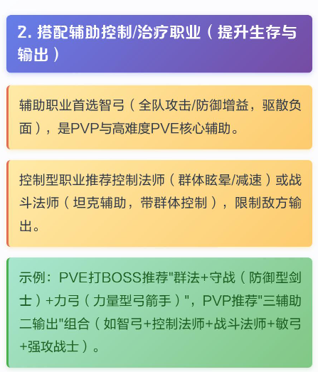 辅助职业很关键。智弓我最推荐,能给全队加攻防,还能解负面状态,打高难度副本和PVP都少不了。控制法师和战斗法师也不错,一个能晕人减速,一个能扛能控。打BOSS我习惯用群法配守战和力弓,守战扛伤害,群法清小怪,力弓点杀BOSS。PVP可以试试三辅助配两输出,控制保护好主力输出就行。