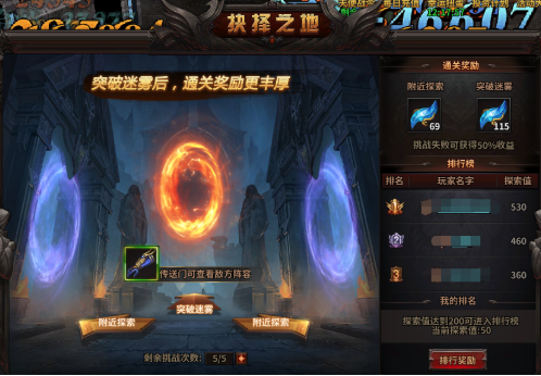 抉择之地包含“附近探索”和“突破迷雾”两种选择。前者可以进行探索,搜寻埋藏在空间深处的秘宝。而后者需要足够强大的实力,进入“突破迷雾”后,你需要面对众多异空间生物,挑战成功即可获得丰厚奖励。但若是挑战失败,则收益会受到一定损失。与此同时,每一个进入抉择之地的勇士,它所获得的探索值,将按照高低值进入排行榜,排名越靠前,奖励越丰厚。