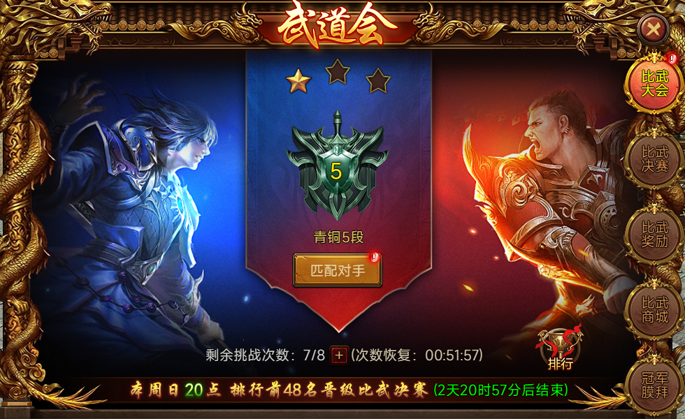 2. 每隔一段时间进行一次比武大会,玩家通过1V1PK提升名次;比武大会结束后,排名和段位重置,根据名次获得奖励,名次越高奖励越丰厚。