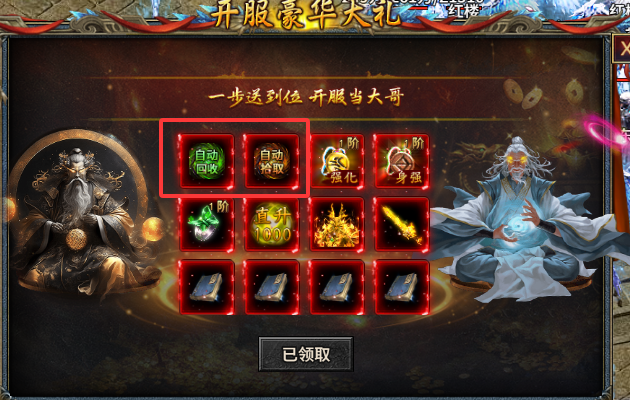 专属豪礼内包含了“自动回收”和“自动拾取”两项功能赠送,领取后需要我们手动点击使用