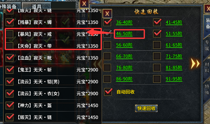 点击勾选需要回收的对应选项后,可以看到之前无法回收的装备也可以勾选上并回收了