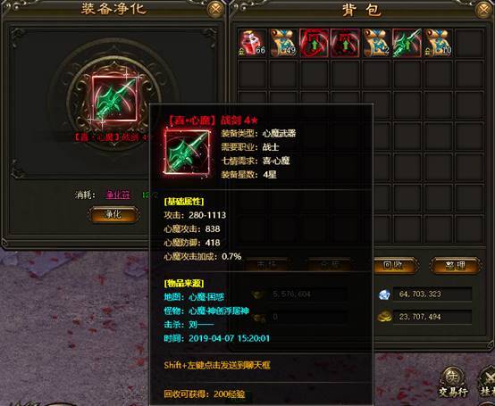同时,在心魔地图里获取的装备,由于受到心魔瘴气的影响,只有一点点可怜的属性,此时需要玩家们将装备带给心魔村的长老进行净化后,才会展现它原有的实力。心魔装备净化后,还会随机出现装备星级,从1~~10星。是欧还是酋,可以找心魔村长老净化一下装备测试测试。