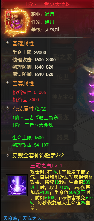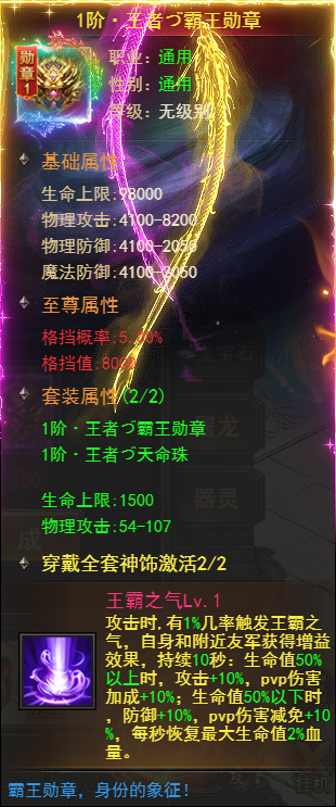 2. 专属技能--王霸之气:攻击时,有几率触发王霸之气,自身和附近友方获得增益效果,生命值50%以上时,增益攻击和pvp伤害加成,生命值50%以下时,增益防御和pvp伤害减免,每秒恢复最大生命值2%血量,持续一段时间,装备等级越高,技能触发几率越高;