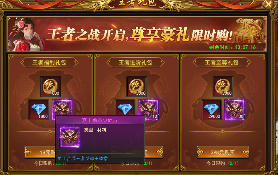 3.王者霸王勋章装备可以通过王者之战里购买王者礼包获取碎片合成;王者天命珠装备可以通过参加王者之战活动获取,排名越高奖励越丰盛。
