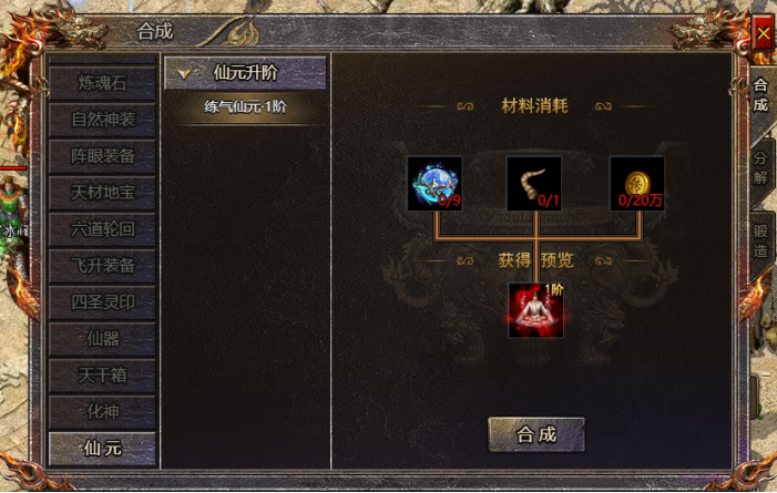 3、仙元精魄可在【合成-仙元】处合成封神装备,装备高阶封神装备的玩家攻击低阶封神装备的玩家时会有增伤效果