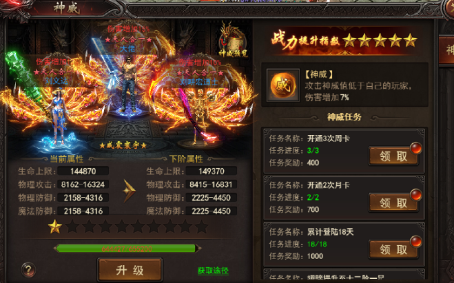 2、通过完成对应的任务获取神威值进行神威提升,获得属性加成