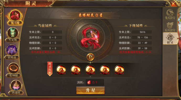 消耗对应附灵石可提升法宝属性,达到一定星级可激活增加法宝额外加强效果