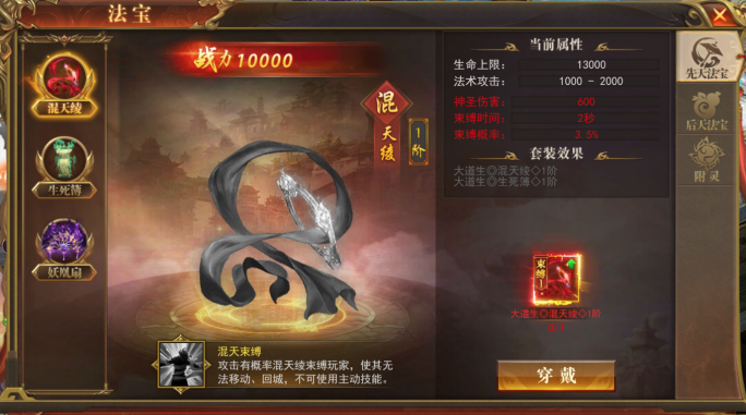 法宝系统分先天法宝(混天绫、生死簿、妖鳳扇),后天法宝(乾坤圈、玲珑塔)。