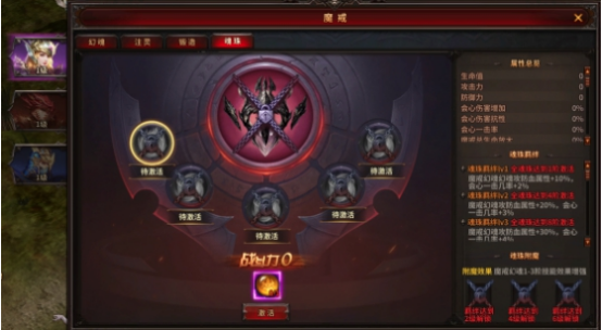 【功能说明】魔戒魂珠,三角色养成5个魂珠,通过魂珠道具进行魂珠激活,激活后多余道具用于升级魂珠