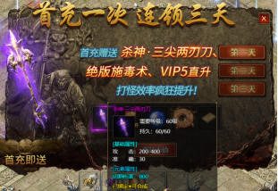 3)领取首充赠送的杀神·三尖两刃刀,加上求道·牛刀小试的特权,打宝速率提升3倍!