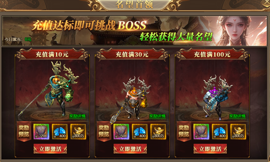 1.  每日充值达到指定金额即可挑战对应的名望首领,击杀后可获得大量名望;