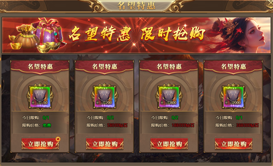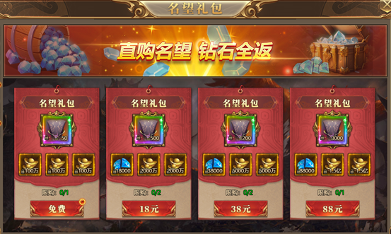 1.  每日消耗钻石可购买大量名望,礼包每日重置;