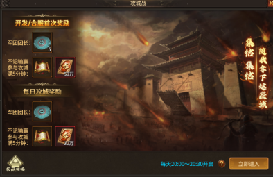 1. 攻城战于开服第二天及之后的每天20:00-20:30开启。