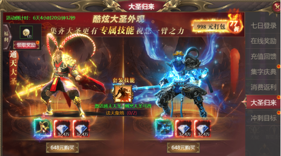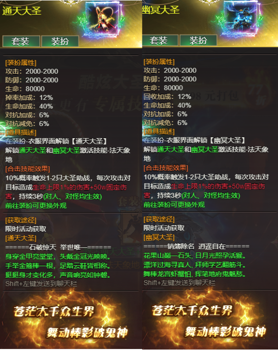 激活两位大圣会激活套装技能【法天象地】,有10%概率触发,持续三秒,每秒对怪造成1%的最高生命上限伤害+50w的固定伤害,前期附带伤害能有效提升打怪效率,挑战BOSS更好打。