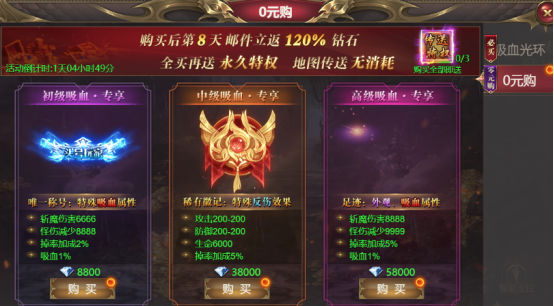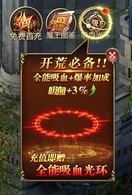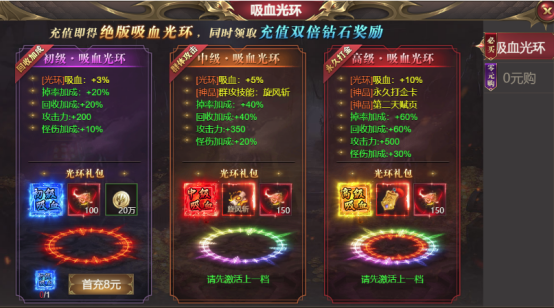 吸血光环共分为初级-中级-高级三个档位,档位不可跳过,也就是如果你需要中级光环,需要先首充8元后获取初级光环,再激活中级光环,高级光环也是同理。