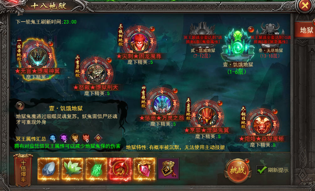 第一次游玩可直接进入第一层(左边第一个)拔舌地狱,每日会赠送100阴阳玉可以用于击杀场景内怪物,推荐优先击杀大怪,能获取更高奖励。