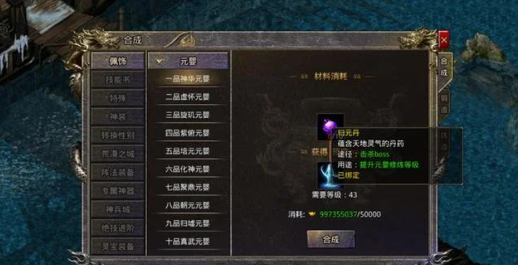 初始合成:使用10个归元丹作为材料,消耗50000绑定元宝,合成一个一品神华元婴。