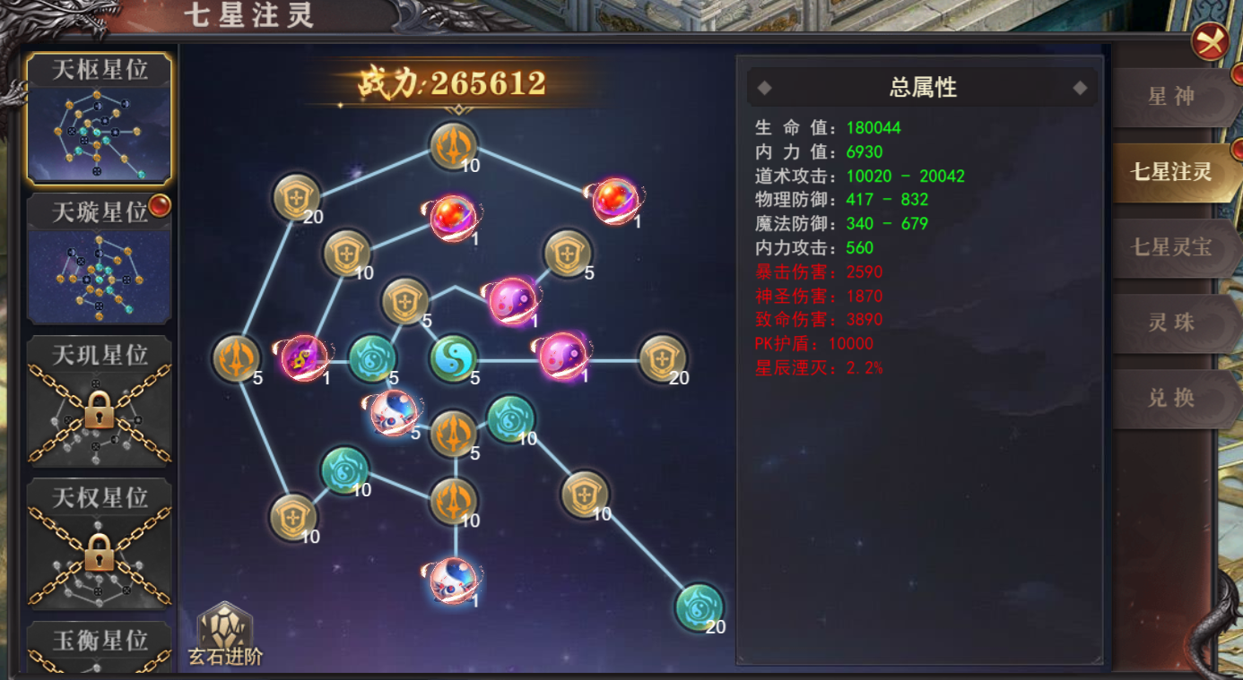 七星注灵星位激活点亮20星可解锁下一个星位,星位通过灵气点亮进阶,节点中会有暗色的星位,用于星辰玄石放置,玄石放置后可通过玄石进阶提升对应等级,玄石升阶后增加湮灭值和特殊属性