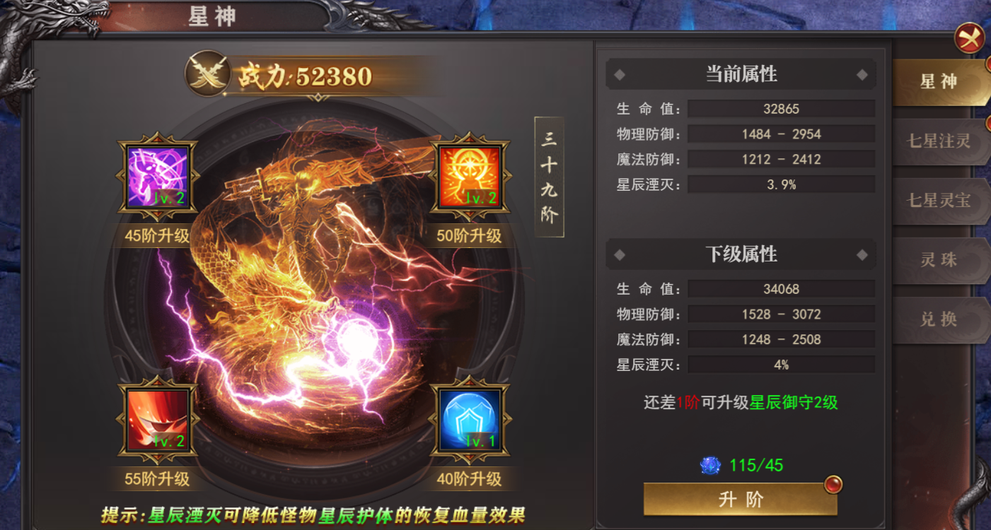 星神每次升阶都可以获取湮灭值属性,每5阶可激活或升级星神技能,获取特殊属性升阶材料可以在归属楼阁奖励中或击杀星辰试炼BOSS获取