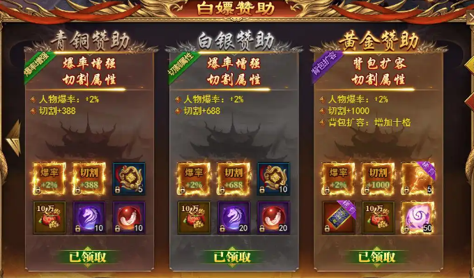 青铜/白银赞助:切割伤害分别+388、+688,精准提升前期输出,刷怪效率直接翻倍,是开荒基础保障。