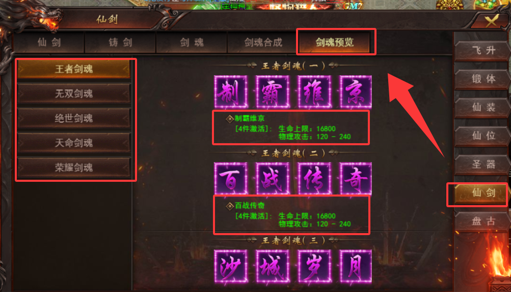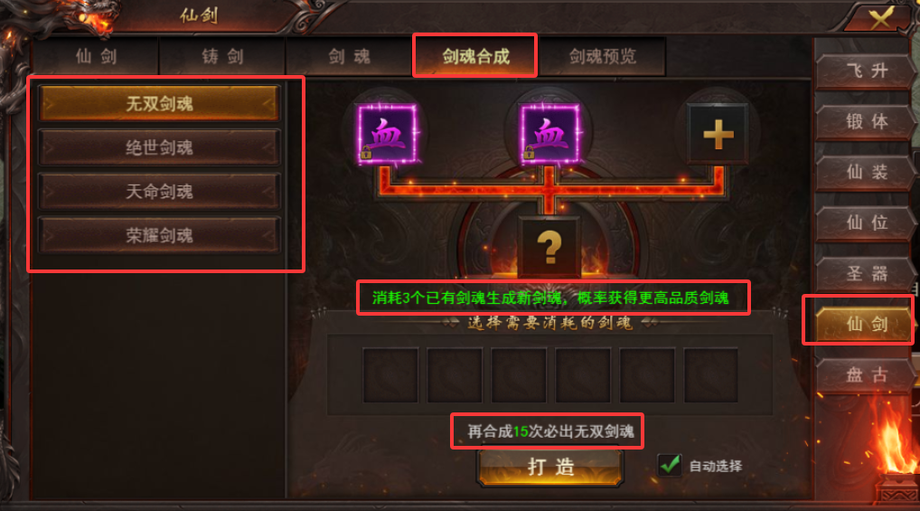 我们选择翻页的“仙剑”-“剑魂合成”,就可以开始合成更高级的剑魂进行更替了