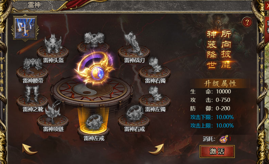 大家激活各种雷神装备部位后,雷神装备能为角色提供生命加成、攻击加成、防御加成、攻击上限、攻击下限。