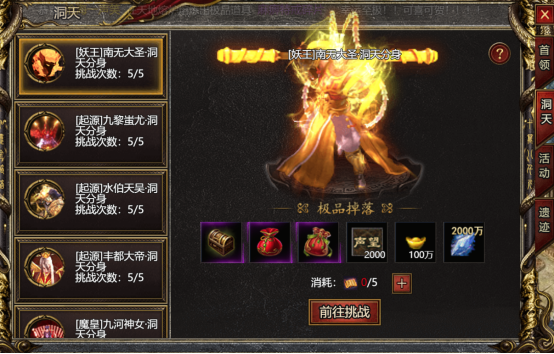值得一提的是,洞天BOSS的名称和原有地图中的BOSS名字是相同的,难度也相对相同。因此,勇士们可以根据这些信息作为参考,在选择挑战的时候,可以根据自己的实力来选择适合自己的BOSS难度。而挑战洞天BOSS将会给予玩家丰富的奖励,包括随机神魔宝袋、洞天奖励箱、元宝、声望、随机法宝宝袋、天地精华等等。