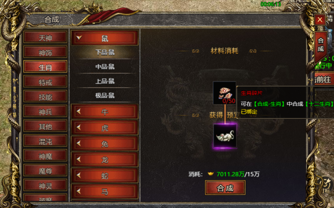 《白蛇传奇》生肖碎片是合成十二生肖装备必备的材料,大家进入到合成系统里的生肖界面,可以消耗生肖碎片,合成各种下品的生肖装备。其中,下品鼠/牛/虎/兔合成需要消耗50个生肖碎片;下品龙/蛇/马/羊合成需要消耗150个生肖碎片;下品猴/鸡/狗/猪合成需要消耗300个生肖碎片。