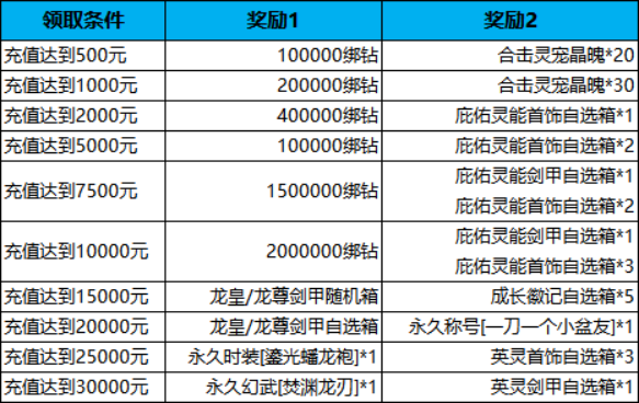 活动内容:活动期间内,限时累计充值达到指定档位,可领取对应档位奖励