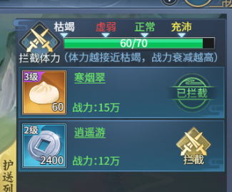 2.拦截需消耗体力值,体力值越低战力衰减比例越高