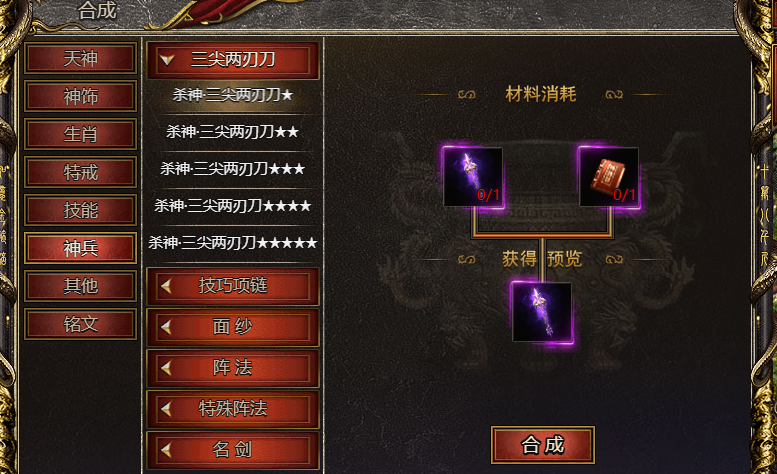 三尖两刃刀可以进行升星,可收集对应星级的【真君秘典】道具,在合成系统-神兵-三尖两刃刀处,可以合成对应星级的三尖两刃刀,三尖两刃刀的星级越高,属性效果会越好,非常推荐大家获取、合成提升。
