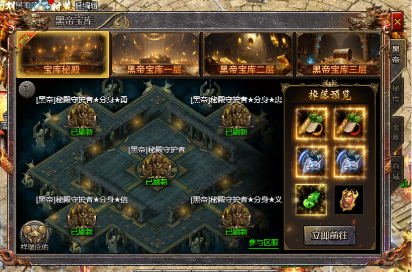2、黑帝宝库为本服副本,高级地图根据本服最大玄冥抗性开启,每个地图掉落不同部位黑帝装备
