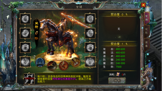可通过精品粮草升阶您的初始坐骑,升级强力爽技!充值还可解锁多种化形,激活后可开启多套骑战装备,佩戴击杀坐骑BOSS 或通过灵蕴秘石合成所获得的战骑装备可获得强力属性,收集骑战套装更能整体提升坐骑属性,大幅提升玩家战力。每个化形有专属的独特技能,带给您砍瓜切菜般的体验!